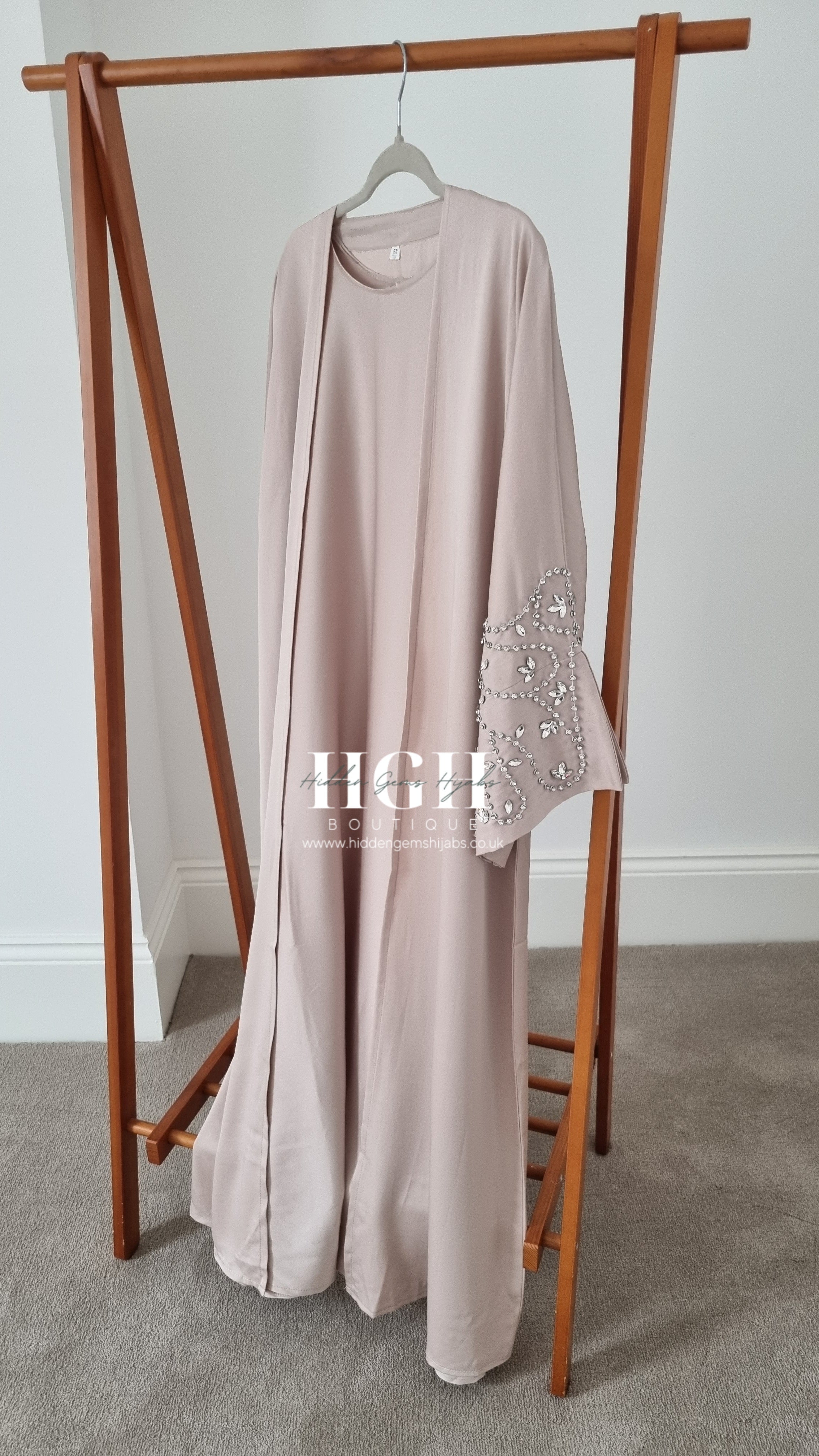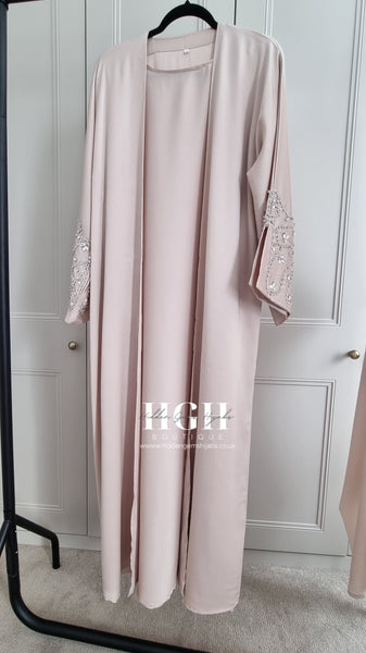 Introducing our luxurious Blush Pink Embellished Abaya. Made from high quality satin, its split sleeves are heavily embellished with diamanté, and comes with a matching inner slip, hijab, and belt. Feel elegant and exclusive with this exclusive design, available only at Hidden Gems Hijabs.