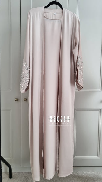 - Outer Satin Abaya with heavy hand embellishments on split sleeves